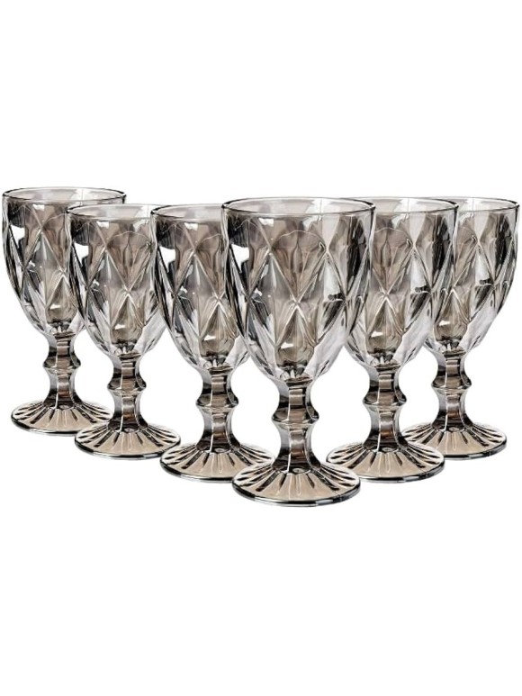 Conjunto Taça de Diamante Fumê c/ 6 peças – elegantes e resistentes, perfeitas para vinhos, sucos e drinks. Design sofisticado em vidro lapidado que