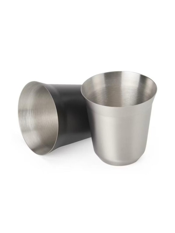 O conjunto conta com dois copos cilíndricos de inox com capacidade ideal para um café expresso ou curto. Seu design moderno e minimalista agrega sofisticação à sua cozinha, cafeteria ou escritório. Por serem empilháveis, ocupam pouco espaço no armário, facilitando o armazenamento.