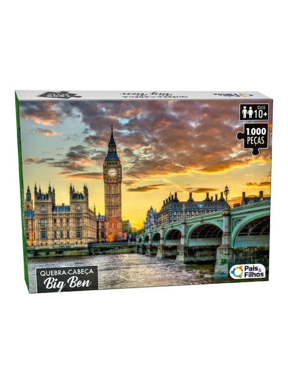 Descrição visual: Ao montar, o quebra-cabeça revela uma vista nítida e elaborada da torre do relógio Big Ben, símbolo nostálgico da Inglaterra. A arte traz tons realistas e vibrantes, perfeitos para exibição após a montagem.