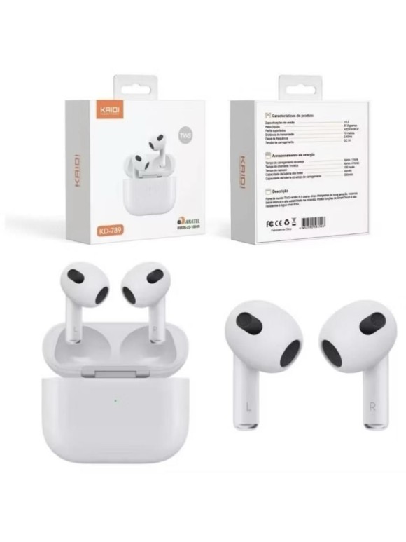 - Fone de Ouvido Bluetooth Sem Fio Kaidi TWS KD-789 com Microfone Integrado, Som Surround Premium e Autonomia de 6 Horas