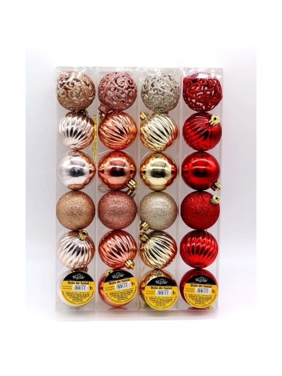 O Kit Bola 6 cm C/6 PCS Sortida se destaca pela sua excelente relação entre custo, beleza e resistência. O poliestireno proporciona acabamento reluzente, com brilho intenso que reflete as luzes natalinas de forma encantadora.