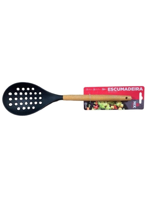 ESCUMADEIRA VAZADA DE SILICONE C/CABO DE MADEIRA UN.