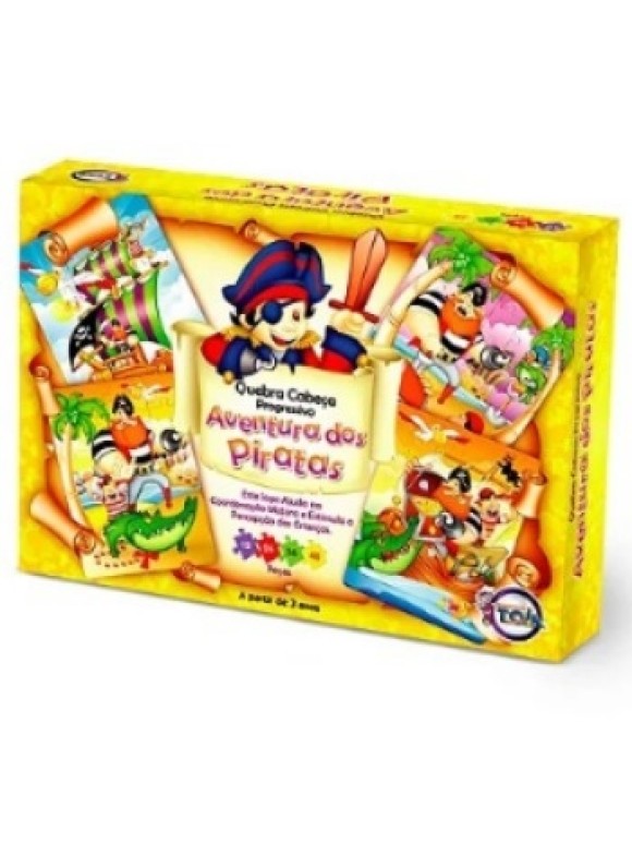 diversão está garantida com o Quebra-cabeça Progressivo Aventuras dos Piratas, montar e conseguir formar um dos 4 painéis com diversos navios, tesouros e piratas coloridos é um excelente exercício para as crianças. Chame toda a turma para interagir, o Quebra-cabeça Aventuras dos Piratas é Progressivo podendo ser compartilhado com diferentes níveis. Quebra-cabeça Progressivo Aventuras dos Piratas proporciona grandes benefícios para a criançada, é um jogo que estimula de forma fantástica o cérebro, gerando de forma lúdicas inúmeras benesses.