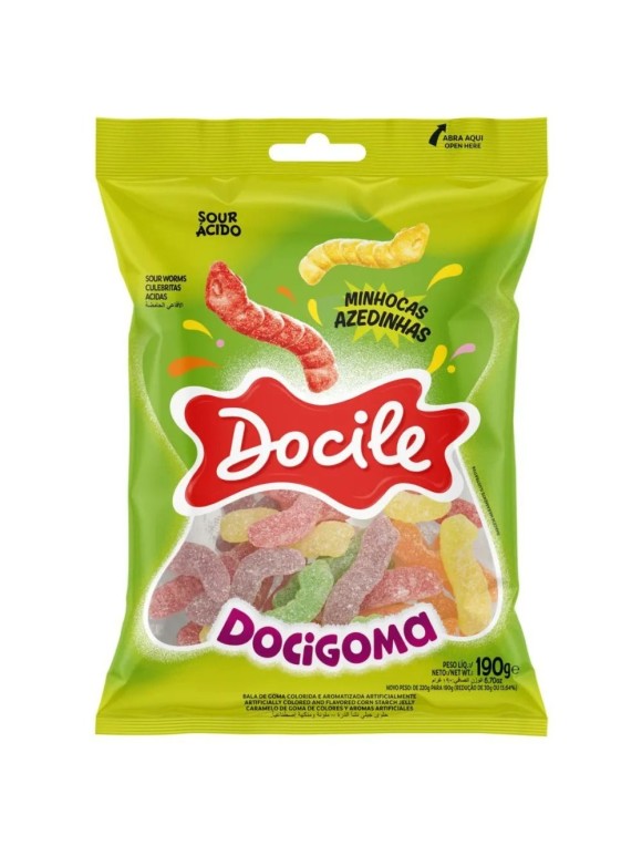 A Docigoma Minhocas Azedinhas 190g se destaca por reunir em um único pacote uma variedade de balas de goma coloridas e extremamente saborosas, revestidas por açúcar especial ácido que proporciona o famoso efeito sour. Cada minhoca possui uma combinação de cores, trazendo contraste visual e deixando o pacote ainda mais atrativo para consumidores de todas as idades.