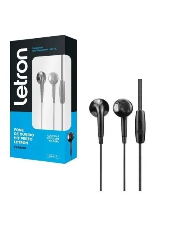 FONE DE OUVIDO HIT PRETO EARBUDS C/FIO E MICROFONE LETRON UN.